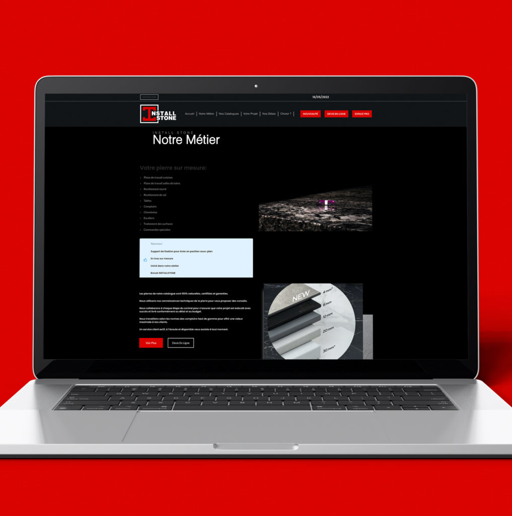 Dans le cadre de sa transformation digitale, Install Stone nous a confié la mission de conception ainsi que le développement de son identité graphique, de son site ainsi de l’Espace Pro qui regroupe un ensemble d’interfaces et d’éléments UI/UX Design.